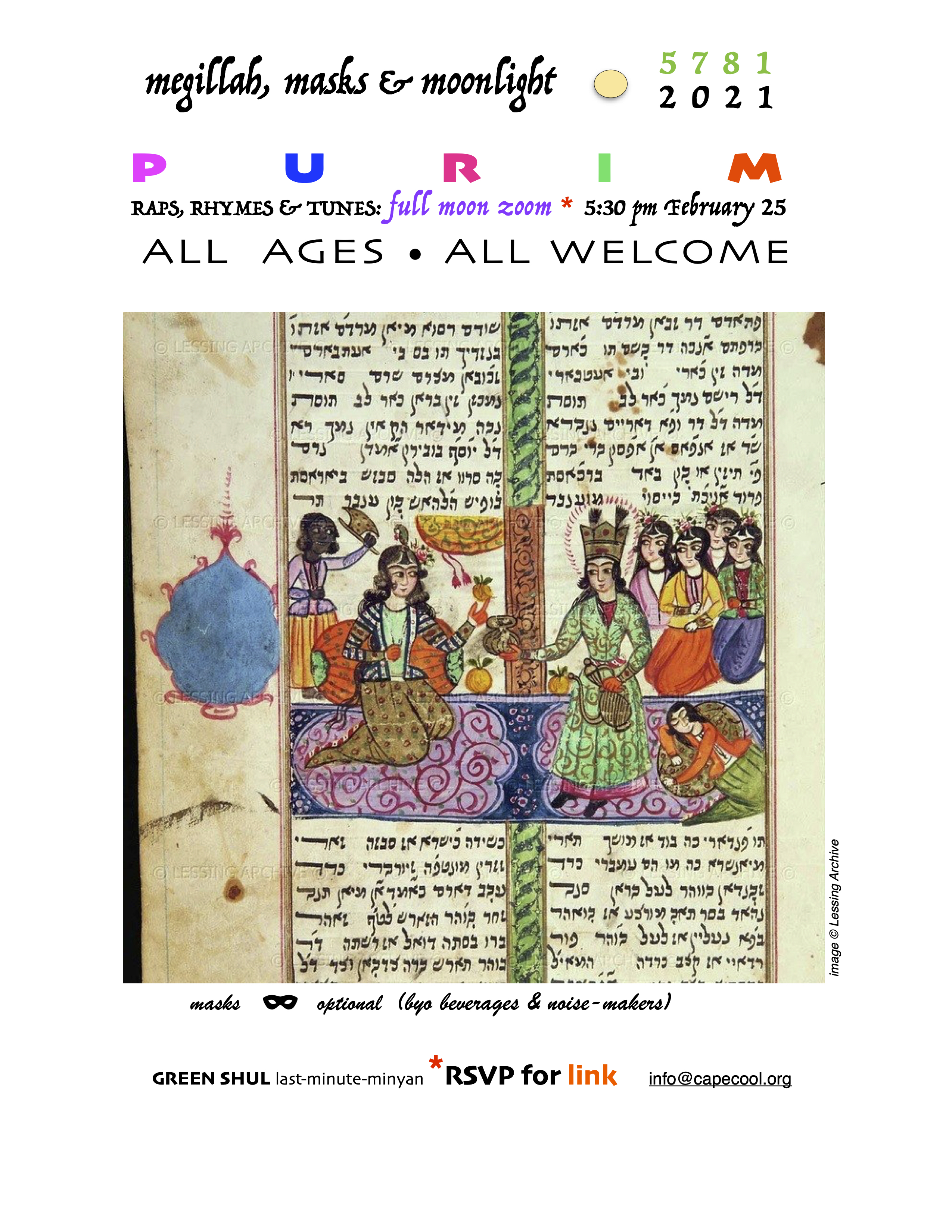 A Sheynm Dank (a beautiful Thank You) to our guests who, along with shpielers Sallie, Sheryl, David, Peter, Rick, Walter, Candace, Gittl & Christopher, helped bring our 5th annual Green Shul Purim Shpiel to life, this year (2021 / 5781) as a Full Moon zoom. Next year together in real life, with horas & hamantashn!